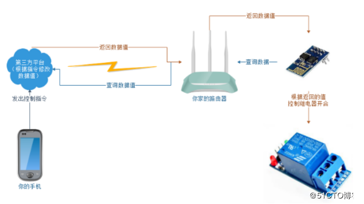 制作过程分为三步,第一步在第三方平台申请远程控制的帐号、密码及APIKEY,第二步要把程序写到esp8266_01中,并进行测试;第三步进行组装并实现控制。在开始之前,我们有必须先简单了解一下ESP8266的工作原理,或者说ESP8266在在手机控制电路通断过程中发挥什么作用,我们来看下面的这张图